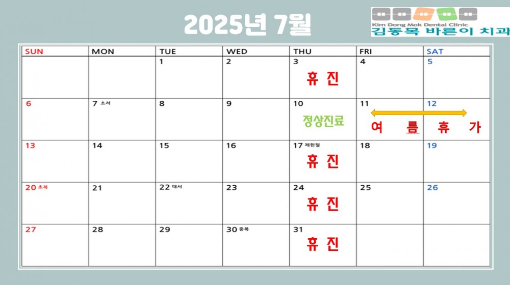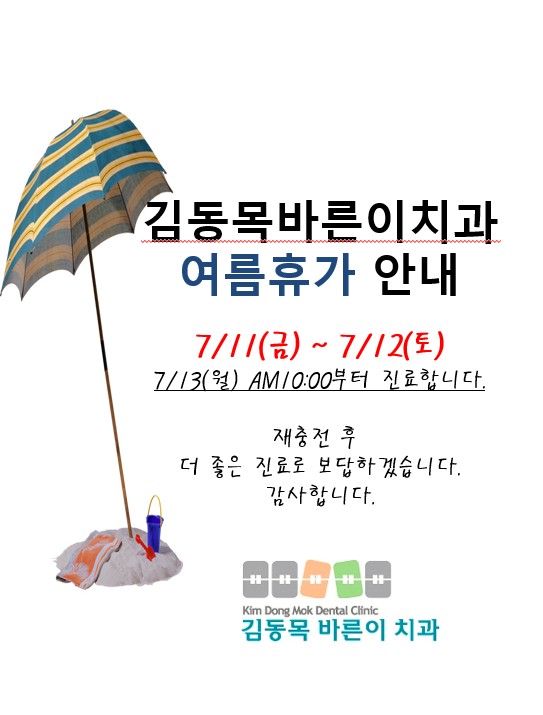 2025년 7월 진료,여름휴가 안내문 페이지 정보 작성자 김동목바른이치과 작성일25-06-17 10:23 조회543회 댓글0건 관련링크 이전글 다음글 목록 본문 김동목바른이치과 2025년 7월 진료,여름휴가 안내문입니다.참고하셔서 내원부탁드립니다 댓글목록 등록된 댓글이 없습니다. 이전글 다음글 목록