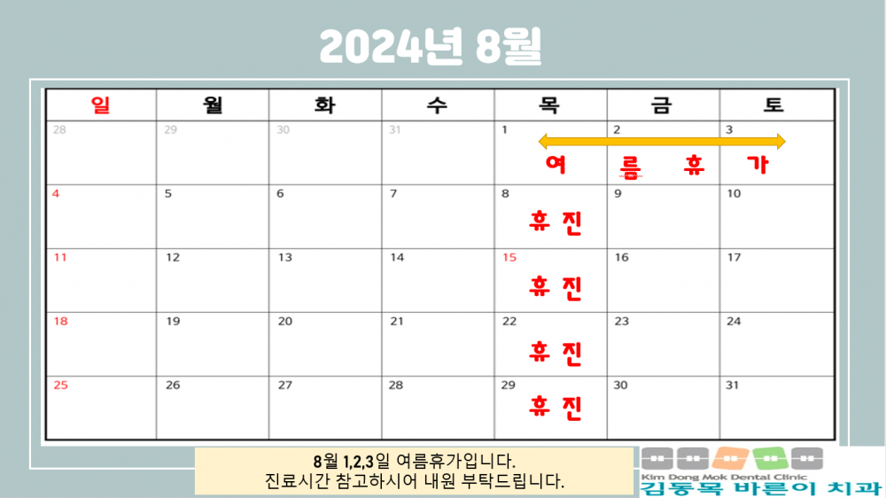 2024년 8월 진료 안내입니다. 페이지 정보 작성자 김동목바른이치과 작성일24-07-27 09:46 조회1,504회 댓글0건 관련링크 이전글 다음글 목록 본문 2024년 8월 진료 안내입니다. 댓글목록 등록된 댓글이 없습니다. 이전글 다음글 목록