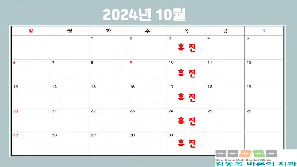 2024년 10월 진료 안내입니다 페이지 정보 작성자 김동목바른이치과 작성일24-09-23 10:38 조회1,102회 댓글0건 관련링크 이전글 다음글 목록 본문 2024년 10월 진료 안내입니다 댓글목록 등록된 댓글이 없습니다. 이전글 다음글 목록