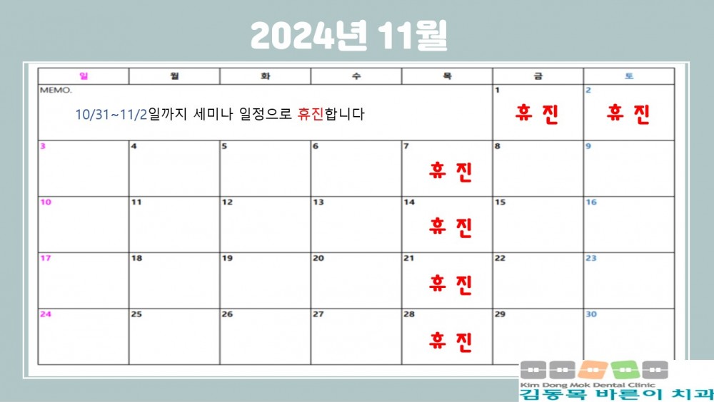2024년 11월 진료 안내입니다 페이지 정보 작성자 김동목바른이치과 작성일24-10-21 11:08 조회1,230회 댓글0건 관련링크 이전글 다음글 목록 본문 2024년 11월 진료 안내입니다 댓글목록 등록된 댓글이 없습니다. 이전글 다음글 목록