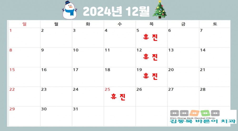 2024년 12월 진료 안내입니다 페이지 정보 작성자 김동목바른이치과 작성일24-11-16 11:26 조회1,053회 댓글0건 관련링크 이전글 다음글 목록 본문 2024년 12월 진료 안내입니다 댓글목록 등록된 댓글이 없습니다. 이전글 다음글 목록