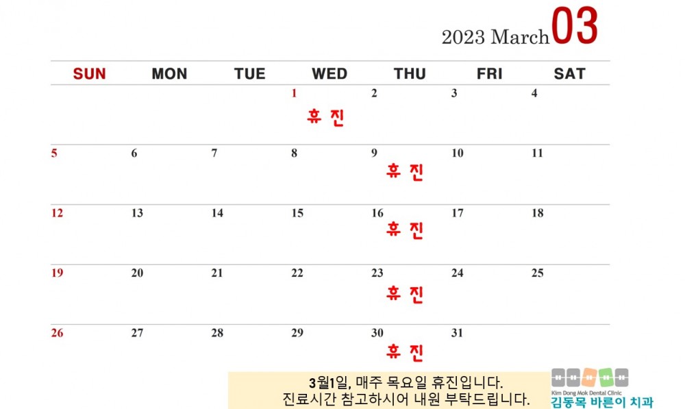2023년 03월 진료안내 입니다. 페이지 정보 작성자 김동목바른이치과 작성일23-02-28 10:05 조회2,153회 댓글0건 관련링크 이전글 다음글 목록 본문 댓글목록 등록된 댓글이 없습니다. 이전글 다음글 목록
