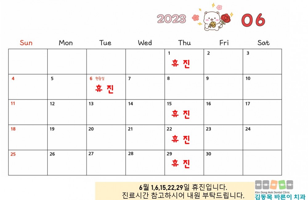 2023년 06월 진료안내 입니다. 페이지 정보 작성자 김동목바른이치과 작성일23-05-24 14:56 조회2,101회 댓글0건 관련링크 이전글 다음글 목록 본문 댓글목록 등록된 댓글이 없습니다. 이전글 다음글 목록