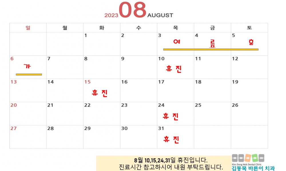 2023년 08월 진료안내 입니다. 페이지 정보 작성자 김동목바른이치과 작성일23-08-01 09:43 조회1,941회 댓글0건 관련링크 이전글 다음글 목록 본문 댓글목록 등록된 댓글이 없습니다. 이전글 다음글 목록