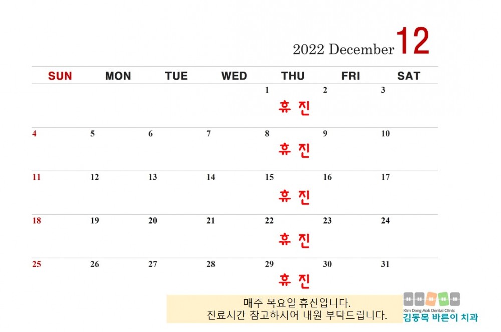 2022년 12월 진료안내 입니다. 페이지 정보 작성자 김동목바른이치과 작성일22-11-25 14:37 조회2,169회 댓글0건 관련링크 이전글 다음글 목록 본문 댓글목록 등록된 댓글이 없습니다. 이전글 다음글 목록