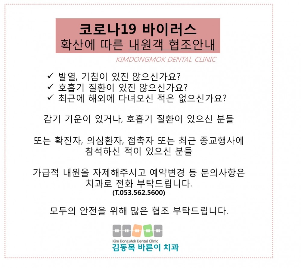 코로나19 확산에 따른 내원객 협조안내. 페이지 정보 작성자 김동목바른이치과 작성일20-02-24 19:32 조회3,349회 댓글0건 관련링크 이전글 다음글 목록 본문 댓글목록 등록된 댓글이 없습니다. 이전글 다음글 목록