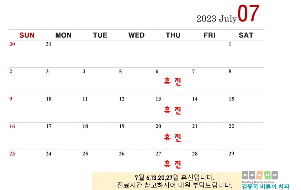 2023년 07월 진료안내 입니다. 페이지 정보 작성자 김동목바른이치과 작성일23-06-27 10:01 조회2,122회 댓글0건 관련링크 이전글 다음글 목록 본문 댓글목록 등록된 댓글이 없습니다. 이전글 다음글 목록