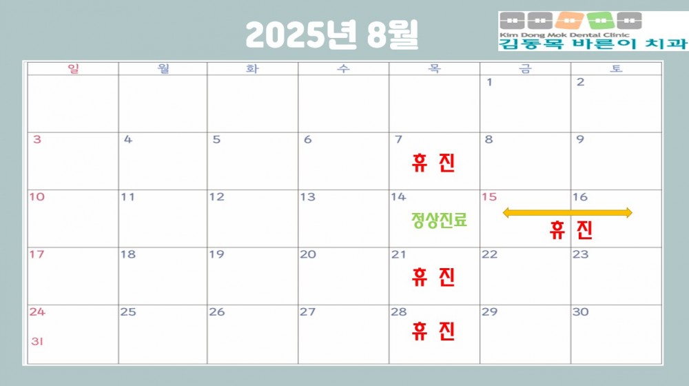 김동목바른이치과 2025년 8월 진료안내입니다 페이지 정보 작성자 김동목바른이치과 작성일25-07-21 10:14 조회442회 댓글0건 관련링크 이전글 다음글 목록 본문 김동목바른이치과 2025년 8월 진료안내입니다 댓글목록 등록된 댓글이 없습니다. 이전글 다음글 목록