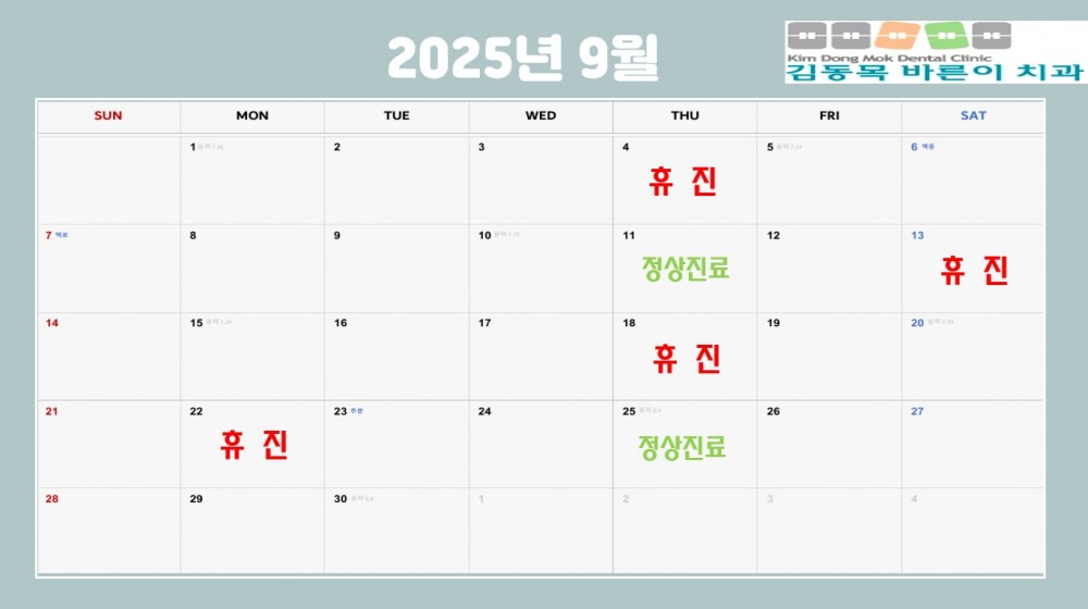 2025년 9월 진료안내입니다. 페이지 정보 작성자 김동목바른이치과 작성일25-08-19 10:59 조회433회 댓글0건 관련링크 이전글 다음글 목록 본문 김동목바른이치과 2025년 9월 진료안내입니다. 댓글목록 등록된 댓글이 없습니다. 이전글 다음글 목록