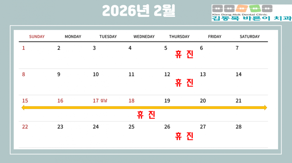 2026년 2월 진료안내입니다. 페이지 정보 작성자 김동목바른이치과 작성일26-01-19 10:16 조회414회 댓글0건 관련링크 이전글 다음글 목록 본문 2026년 2월 진료안내입니다. 댓글목록 등록된 댓글이 없습니다. 이전글 다음글 목록