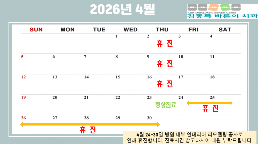 2026년 4월 진료안내입니다. 페이지 정보 작성자 김동목바른이치과 작성일26-03-30 14:59 조회122회 댓글0건 관련링크 이전글 다음글 목록 본문 2026년 4월 진료안내입니다. 댓글목록 등록된 댓글이 없습니다. 이전글 다음글 목록